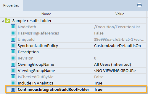 Eigenschaft ContinuousIntegrationBuildRootFolder für Sample results folder auf True gesetzt