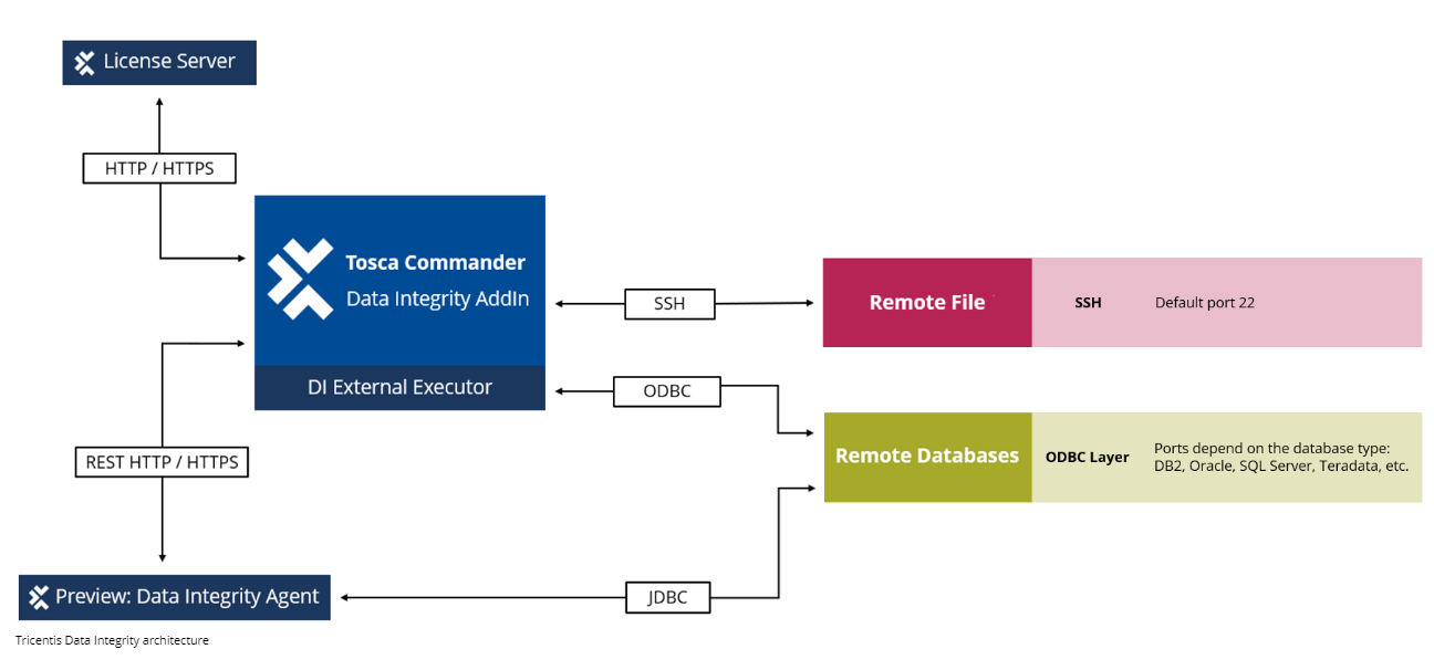 Schauen Sie sich die nachstehende Abbildung an, um mehr über die grundlegende Architektur von Tricentis Data Integrity zu erfahren und darüber, wie es sich mit Datenbanken verbindet und welche Ports es benötigt, um zu kommunizieren.