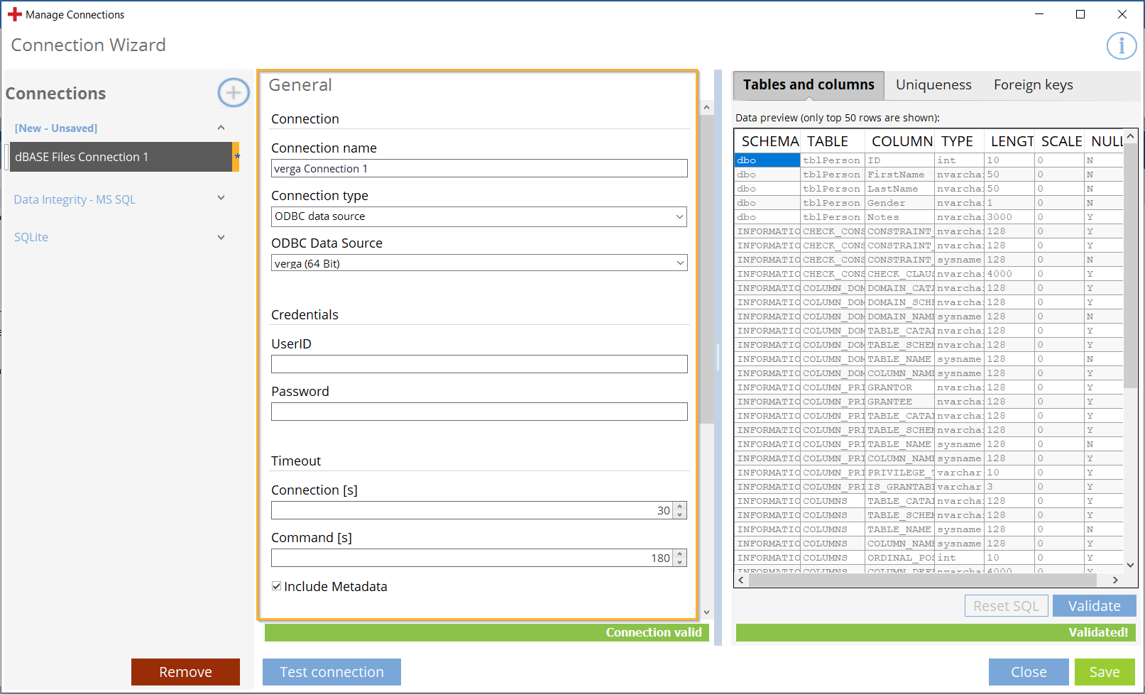 UserID ist obligatorisch, wenn Sie ODBC data source aktiviert haben. Verwenden Sie die gleichen Anmeldedaten, die Sie bei der Konfiguration der ODBC-Verbindung verwendet haben. |