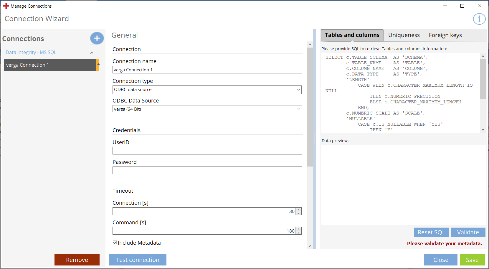 Wenn die Validierung erfolgreich war, lädt der Connection Manager die ersten 50 Zeilen in den Bereich Data preview.