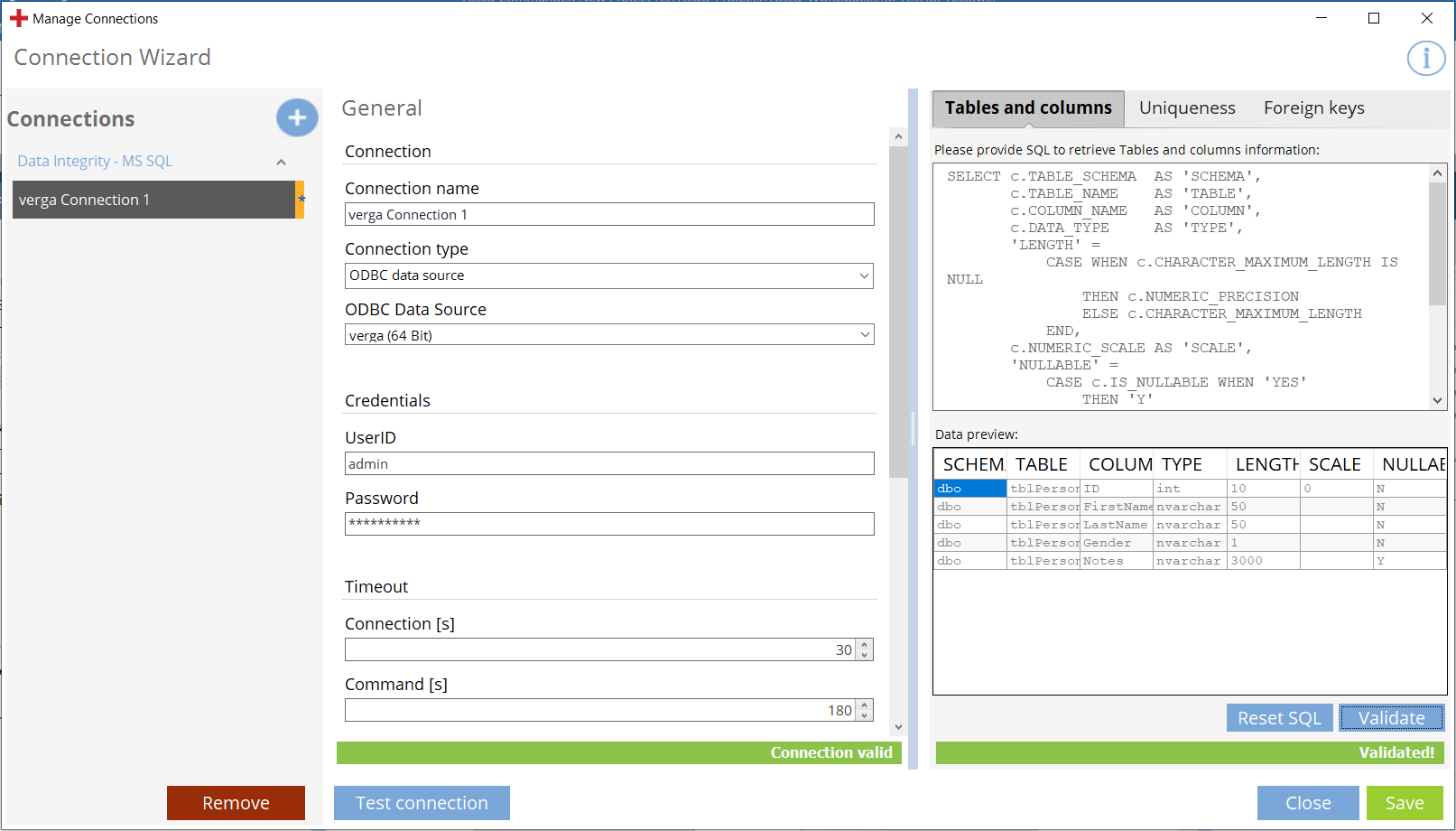 Wenn Sie mehr als ein SQL-Statement auf einmal validieren möchten, modifizieren oder ergänzen Sie alle entsprechenden Statements und klicken Sie auf Save connection.