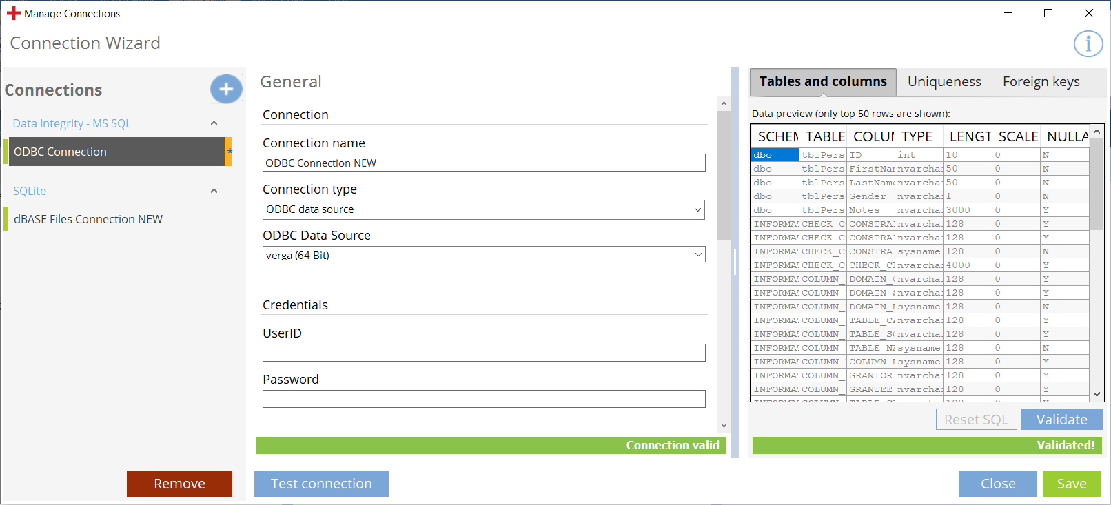 Alle Informationen im Abschnitt General für Database-Verbindungen, Data Integrity-Verbindungen und SQLite-Verbindungen.