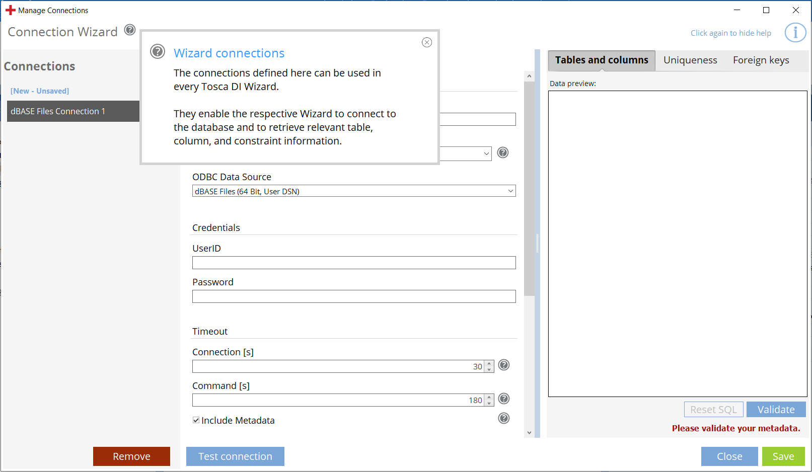 Eine Data Integrity-Verbindung definieren: eine ODBC-Datenquelle oder eine ODBC-Verbindungszeichenfolgeverbindung, die Metadaten enthält.