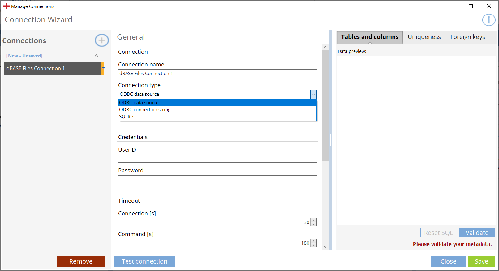 Eine Database-Verbindung definieren: eine ODBC-Datenquelle, eine ODBC-Verbindungszeichenfolge oder eine SQLite-Verbindung ohne Metadaten.