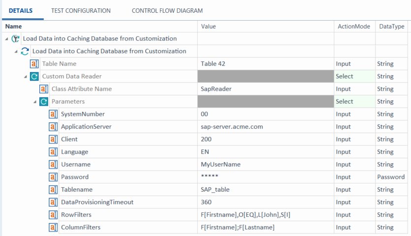 Der SAP-Reader verwendet die in der folgenden Tabelle beschriebenen Parameter. Geben Sie diese Parameter in Ihrem Testschritt an (Beispiel: Daten aus SAP-Datenbanken in die Caching-Datenbank laden).
