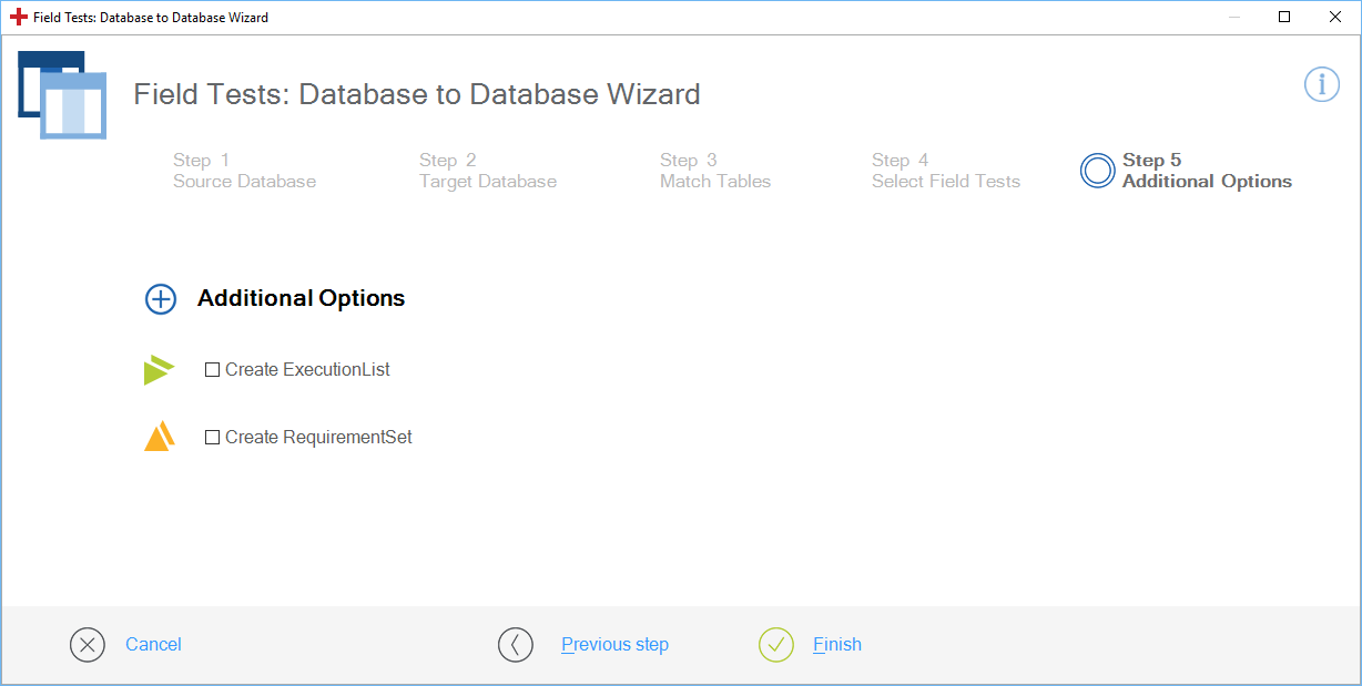 Step 5 - Additional Options des Field Tests: Database to Database Wizard ermöglicht es Ihnen, die folgenden Schritte mit einem Klick und nicht mit mehreren Drag & Drop-Operationen im Tosca Commander durchzuführen: