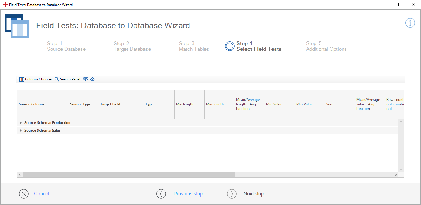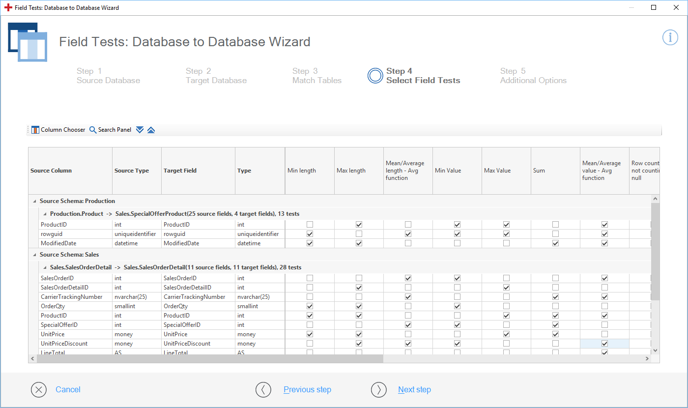 Wählen Sie unter Step 4 die Field Tests für die Tabellenpaare aus, die Sie im vorherigen Schritt abgeglichen haben. Dadurch wird sichergestellt, dass Felder aus Quelle und Ziel die gleichen Anforderungen erfüllen.