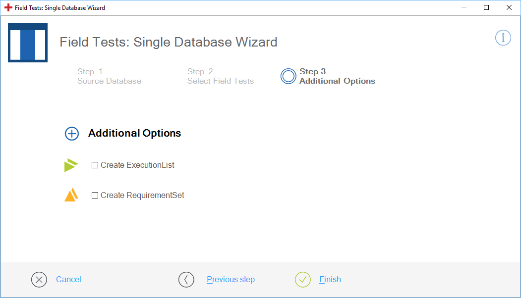 Step 3 - Additional Options des Field Tests: Single Database Wizard ermöglicht es Ihnen, die folgenden Schritte mit einem Klick und nicht mit mehreren Drag & Drop-Operationen im Tosca Commander durchzuführen: