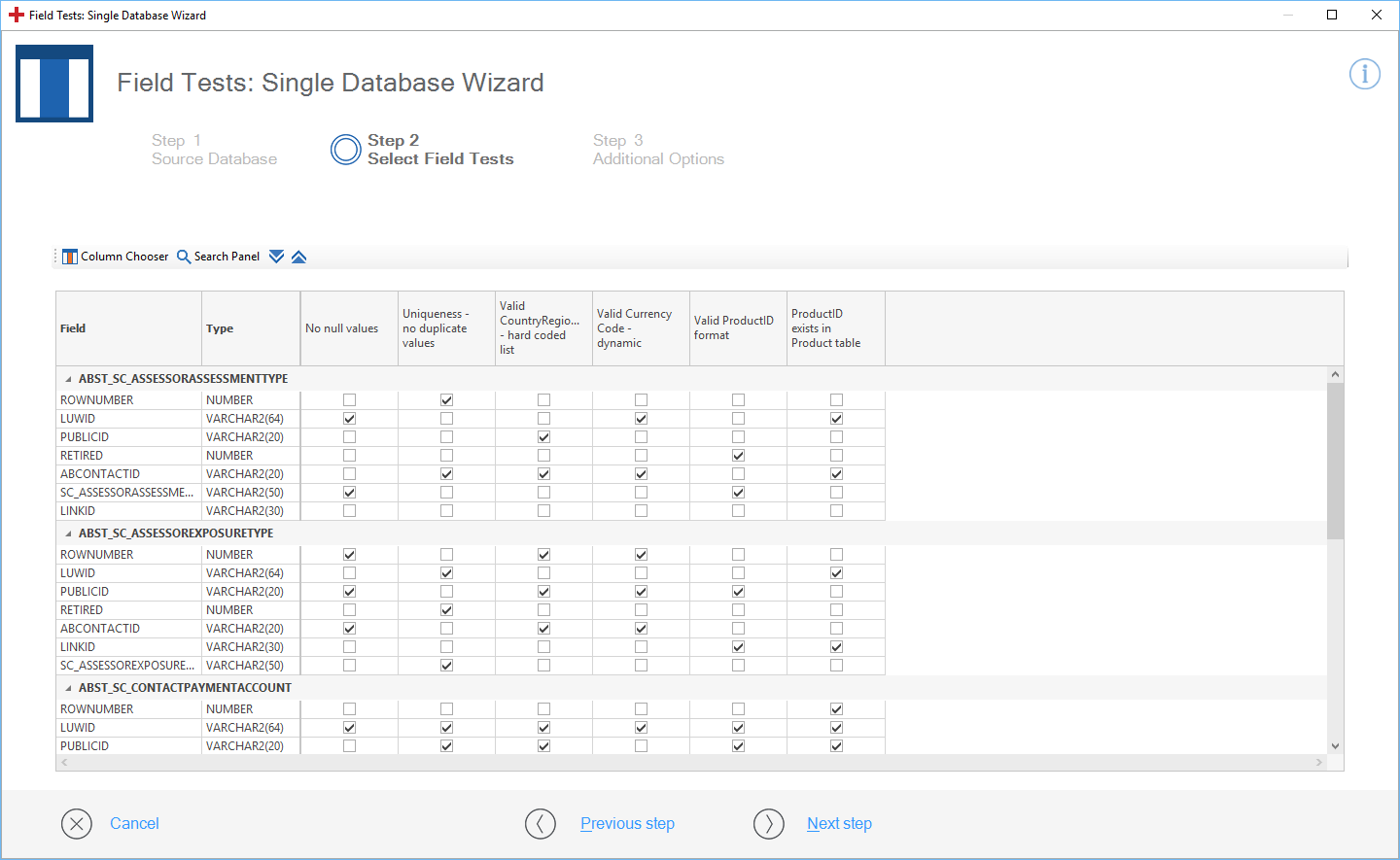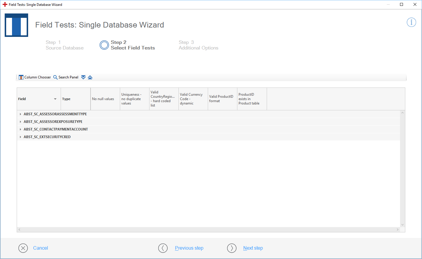Wählen Sie unter Step 2 die Field Tests für Ihre Datenbank aus. Der Field Tests: Single Database Wizard wendet diese Tests auf jede Spalte auf Feldebene an.