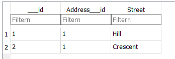Wie im Beispiel gezeigt, wird die Spalte ___id als Primärschlüssel für die Tabellen angelegt. Der Knoten Address hat zwei Street-Wertknoten. Da sie sich wiederholen, wird eine separate Tabelle für den Knoten Street angelegt. Um die Tabelle Street mit der Tabelle Address zu verknüpfen, wird ein Fremdschlüssel Address___id hinzugefügt. In diesem Beispiel gehören Hill und Crescent zur gleichen Address.
