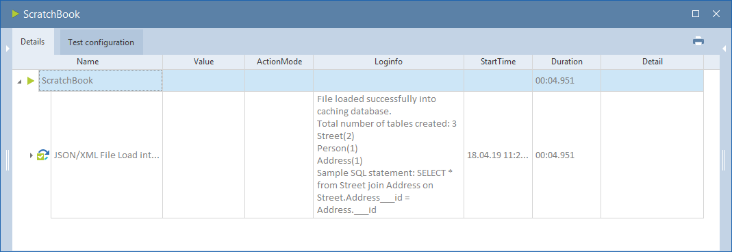 Die Spalte Loginfo im ScratchBook zeigt das Ausführungsergebnis und die erstellten Tabellen: Person, Address, Street.