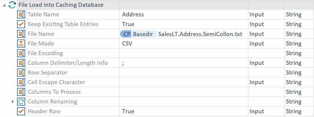 Das Modul File Load into Caching Database enthält die folgenden Attribute: