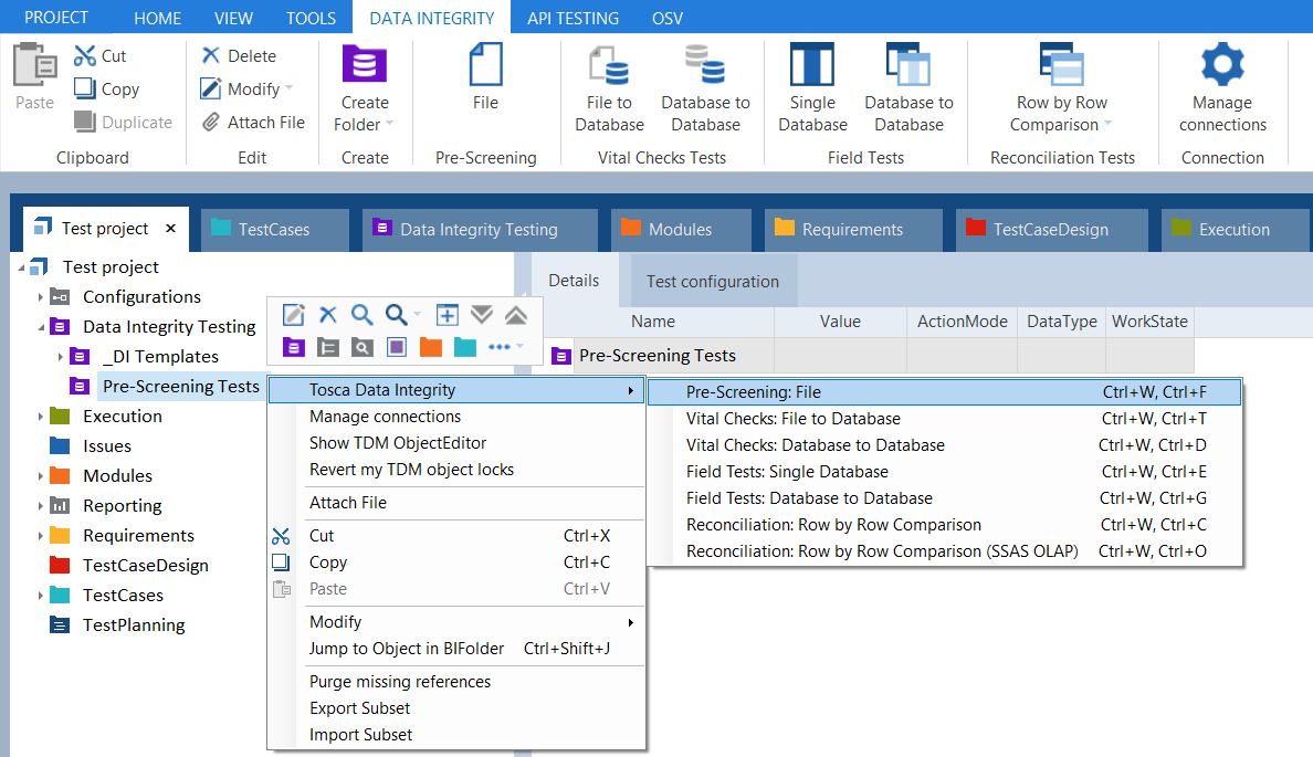 File im dynamischen Menü Data Integrity.Alternativ können Sie auch mit der rechten Maustaste auf einen Data Integrity-Ordner klicken und Tosca Data Integrity->Pre-Screening: File aus dem Kontextmenü auswählen oder STRG+W, STRG+F drücken.