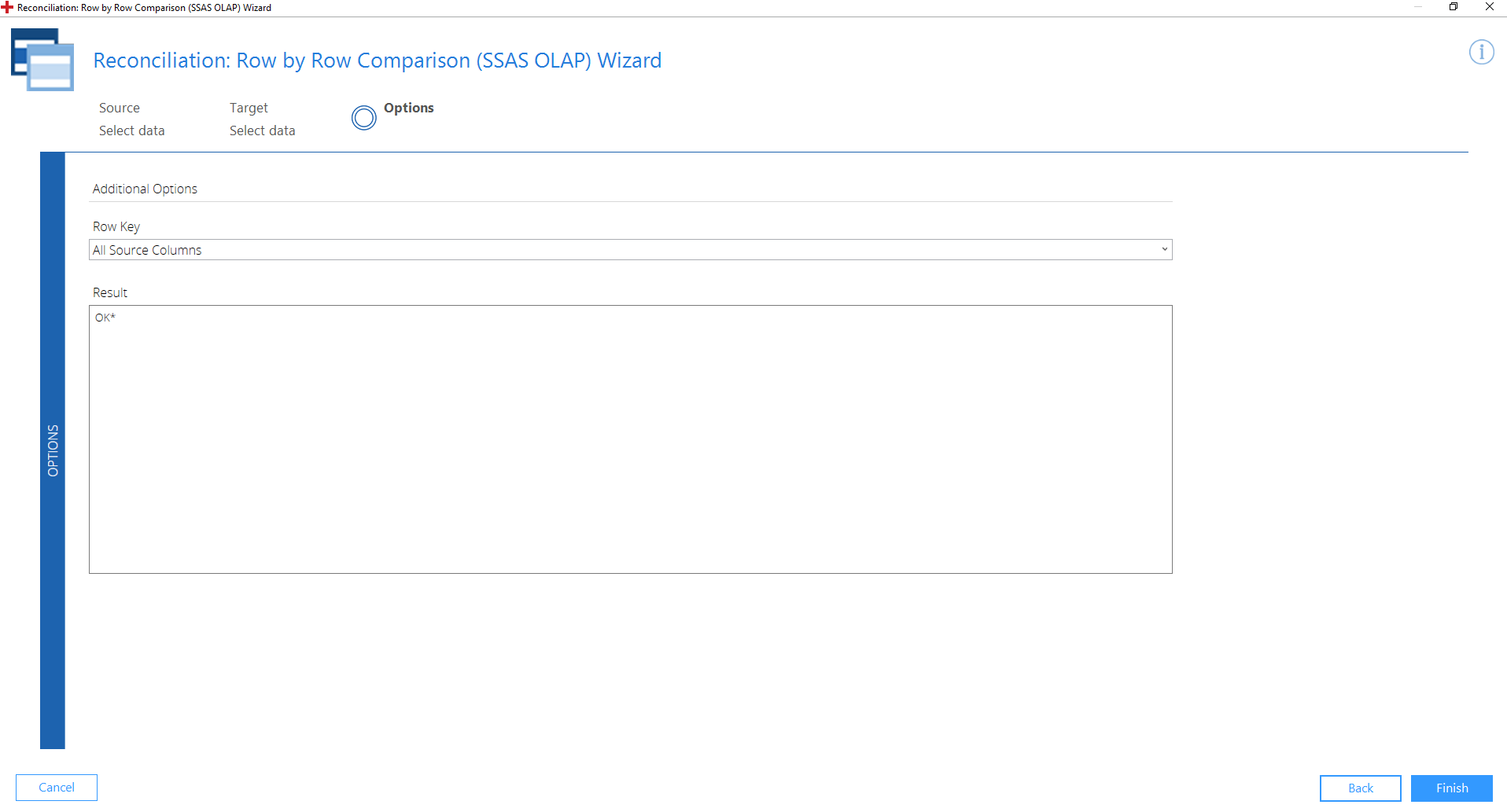 Unter Options im Row by Row Comparison (SSAS OLAP) Wizard können Sie die folgenden Schritte durchführen: