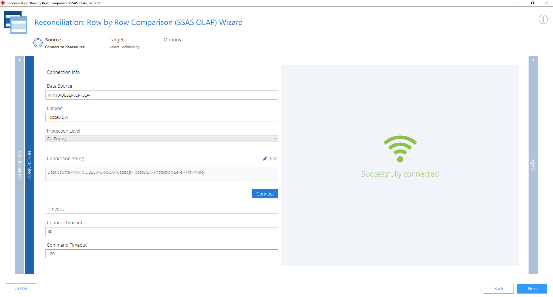 In diesem Feld wird die Verbindungszeichenfolge angezeigt, die der Wizard für die Verbindung zu Ihrer Datenquelle verwendet. Der Row by Row Comparison (SSAS OLAP) Wizard erstellt automatisch eine gültige Verbindungszeichenfolge aus den von Ihnen ausgefüllten Feldern. Wenn Sie die Verbindungszeichenfolge manuell eingeben möchten, klicken Sie auf Edit. |