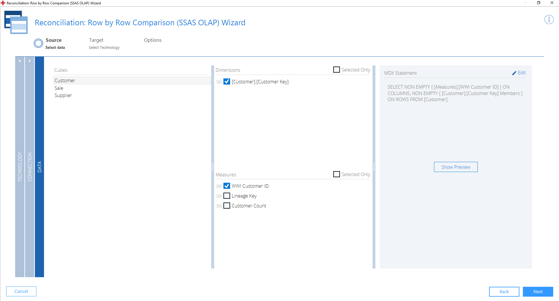 Unter Source im Row by Row Comparison (SSAS OLAP) Wizard verbinden Sie sich mit Ihrer Datenquelle und erstellen ein MDX statement zum Laden Ihrer Daten.