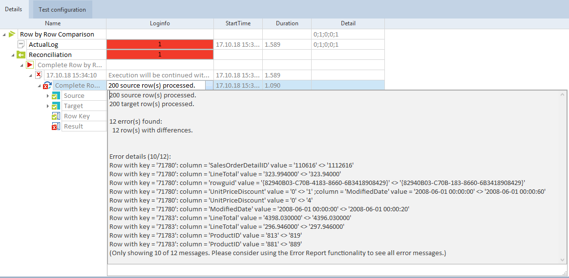 Die Spalte Loginfo listet alle aufgetretenen Fehler auf. Darüber hinaus zeigt sie nähere Informationen zu den ersten 10 Fehlern an, die der Testfall gefunden hat.