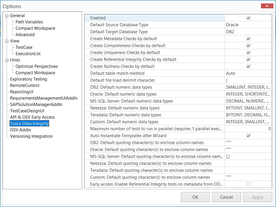 Navigieren Sie zu Project->Options->Tosca Data Integrity.
