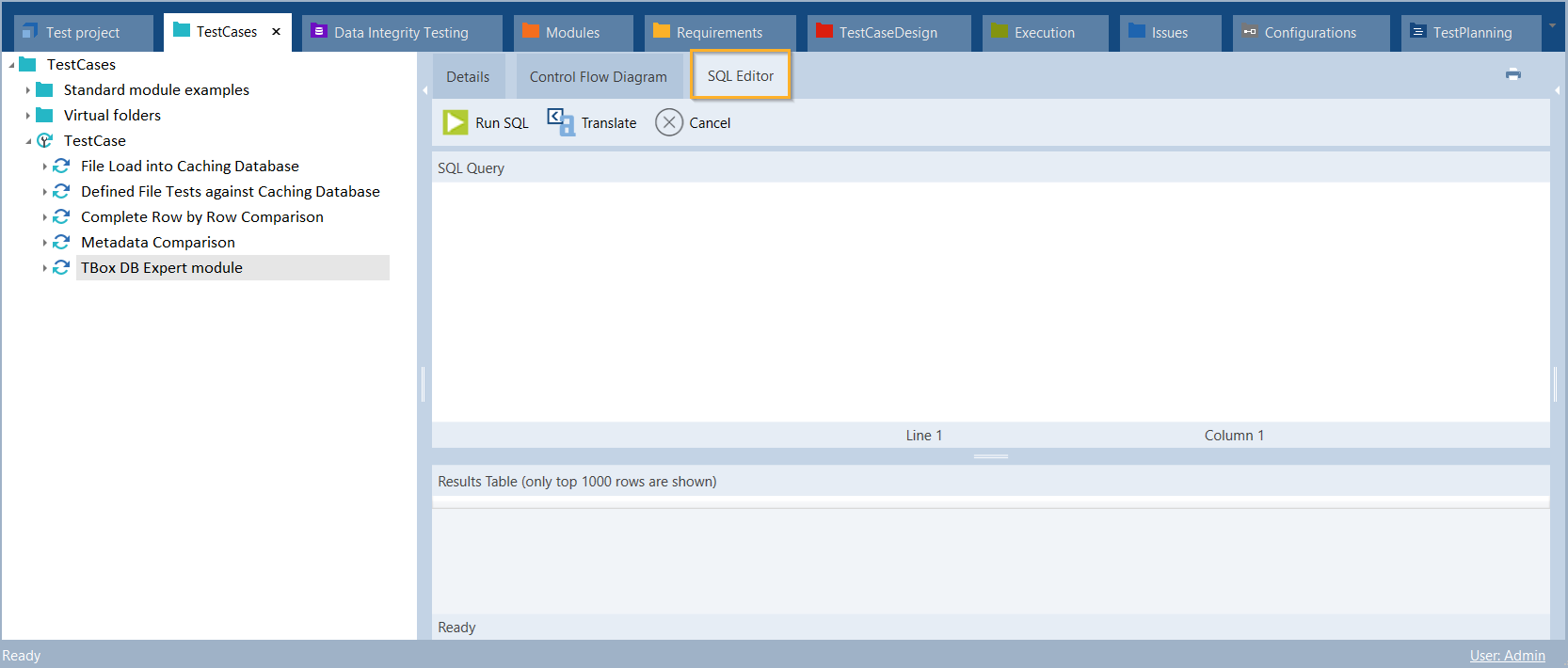 Mit dem SQL Editor können Sie SQL-Statements für Ihren Testfall erstellen und testen, bevor Sie den Testfall ausführen.