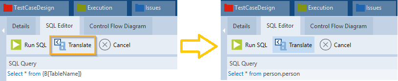 Wenn Sie in Ihren SQL-Statements dynamische Ausdrücke verwenden, können Sie mit der Funktion Translate des SQL Editor den Wert sehen, den Data Integrity zur Laufzeit verwendet.