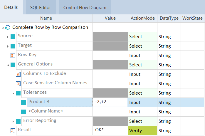 Sie können Toleranzen für Spalten im Testfall Row by Row Comparison festlegen.