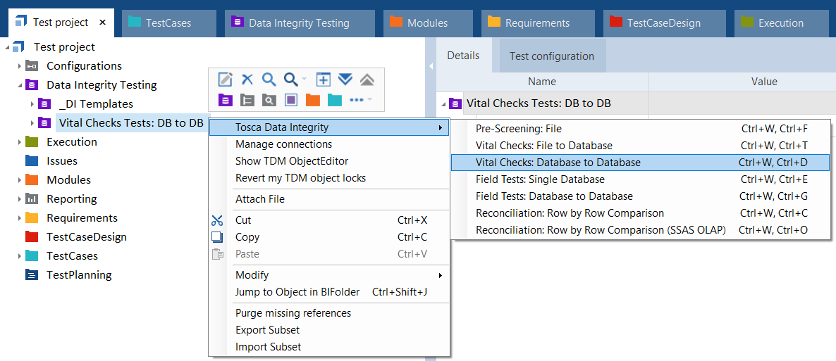 Database to Database im dynamischen Menü Data Integrity.Alternativ können Sie mit der rechten Maustaste auf einen Data Integrity-Ordner klicken und Tosca Data Integrity->Vital Checks: Database to Database aus dem Kontextmenü auswählen oder STRG+W, STRG+D drücken.