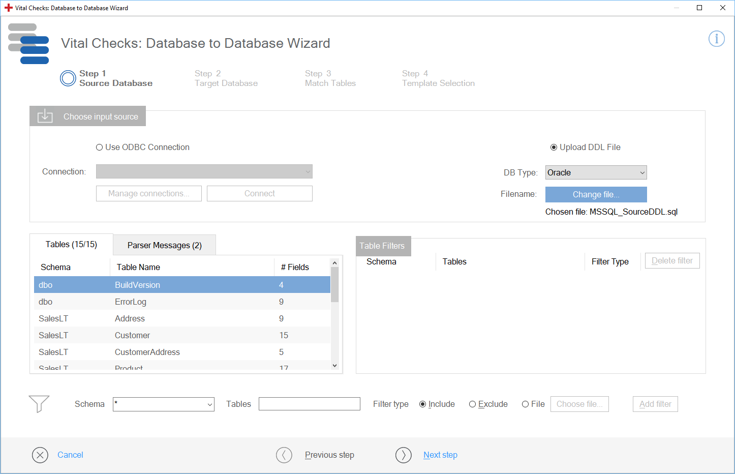 Klicken Sie auf Add filter. Sie können mehr als einen Filter hinzufügen. Der Wizard wendet diese Filter hierarchisch an, um die Auswahl auf bestimmte Tabellen einzuschränken.
