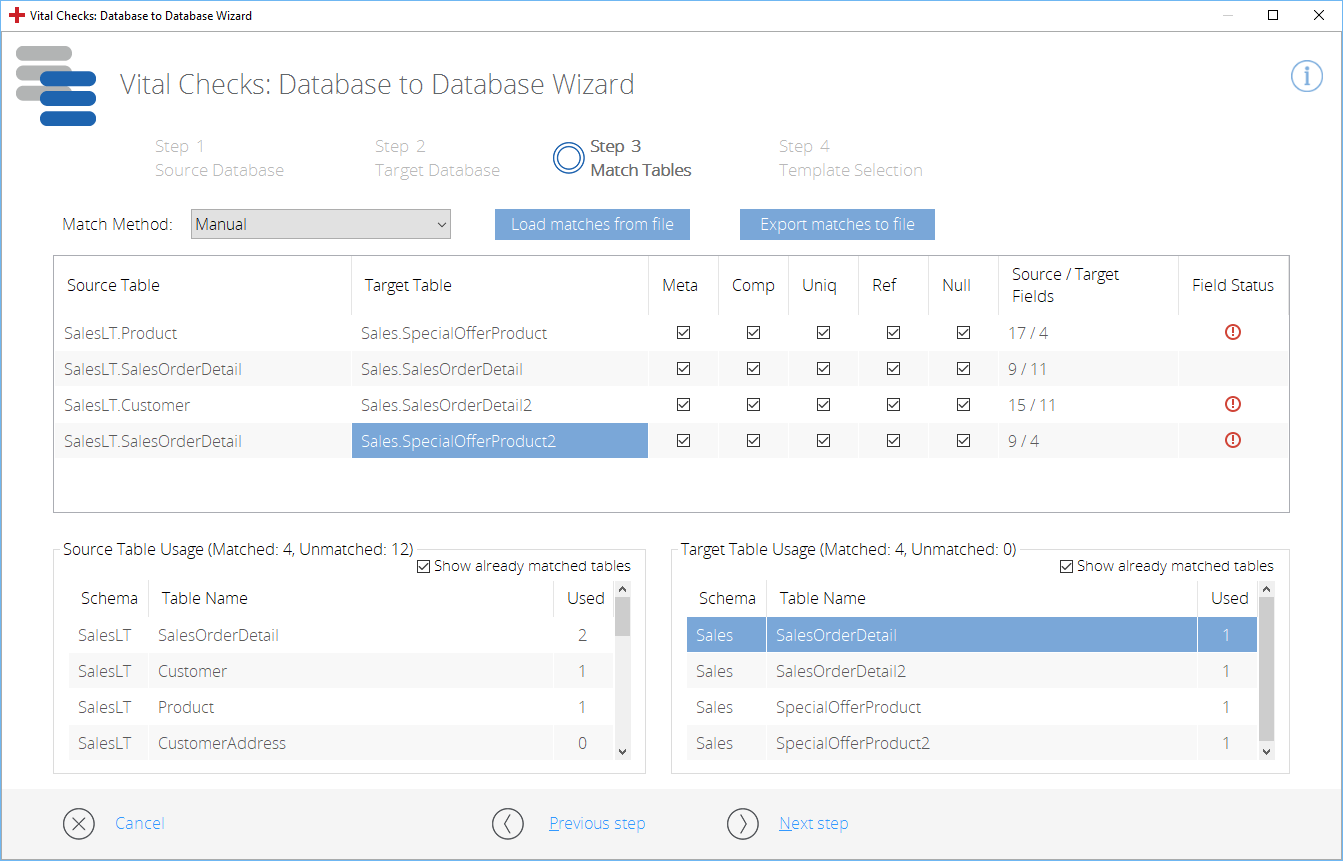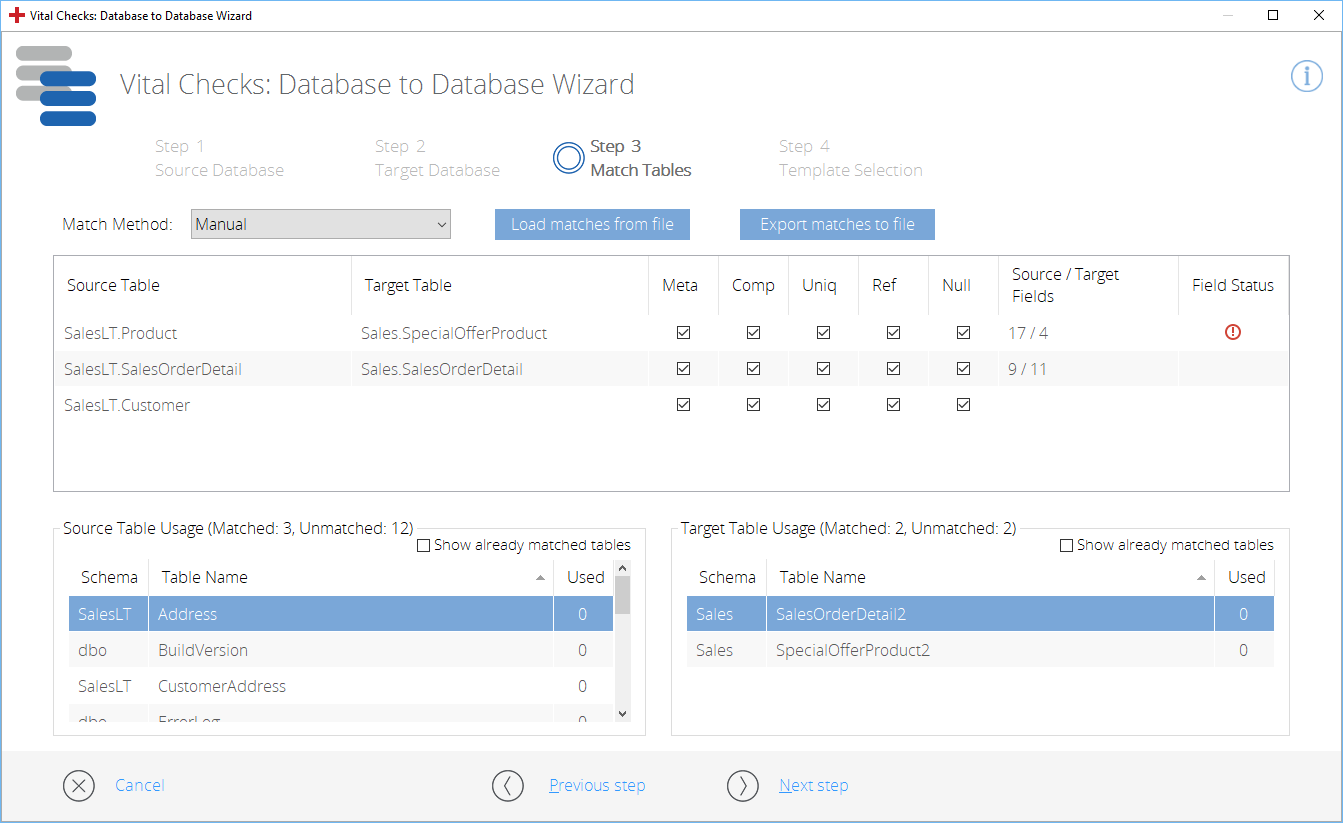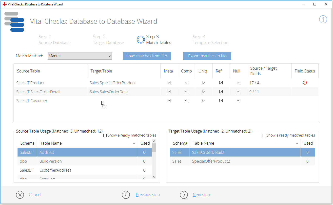 Sie können Ihre Tabellen manuell abgleichen, wenn der Vital Checks: Database to Database Wizard dies nicht automatisch erledigen kann, oder wenn Sie Ihre Tabellen lieber manuell abgleichen möchten.