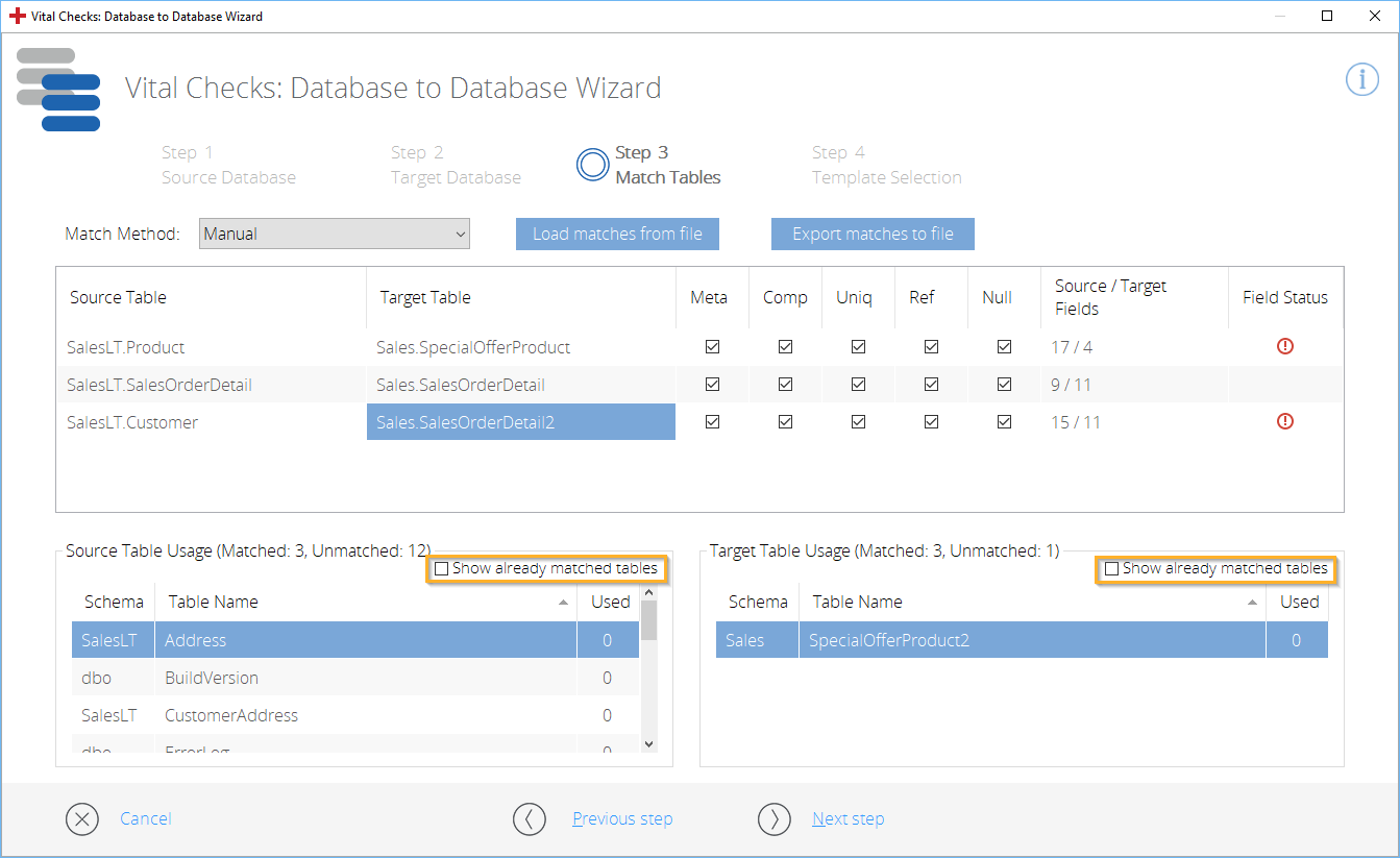 Aktivieren Sie das Kontrollkästchen Show already matched tables in den Bereichen Source Table Usage und Target Table Usage. Der Wizard zeigt dann alle Tabellen an, einschließlich der Tabellen, die bereits abgeglichen wurden.