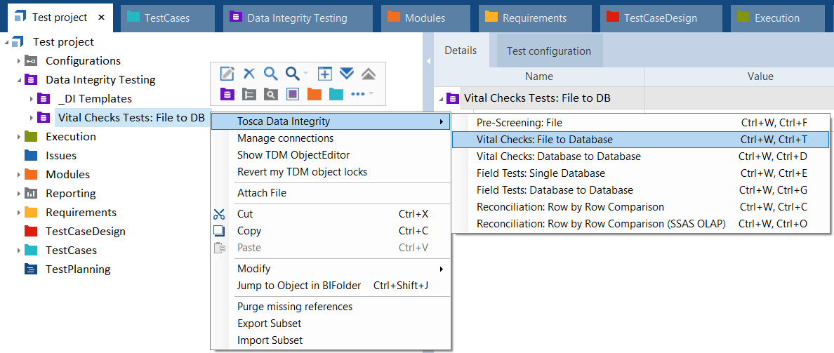 File to Database im dynamischen Menü Data Integrity.Alternativ können Sie mit der rechten Maustaste auf einen Data Integrity-Ordner klicken und Tosca Data Integrity->Vital Checks: File to Database aus dem Kontextmenü auswählen oder STRG+W, STRG+T drücken.