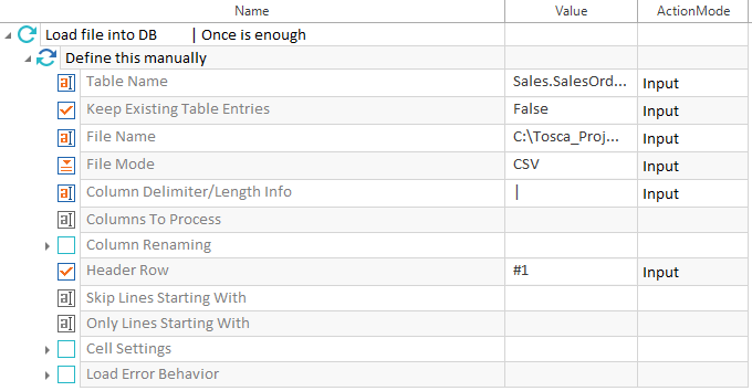 Füllen Sie die Werte des Testfalles Load File into DB aus. Diese Werte sind die gleichen wie die Modulattribute des Moduls File Load into Caching Database.