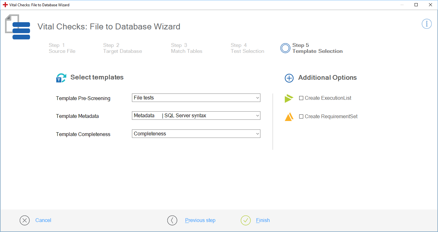 Step 5 ist optional. Sie können auf Finish klicken, ohne Testfall-Vorlagen auszuwählen oder eine Ausführungsliste oder ein Anforderungs-Set zu erstellen. Wenn Sie Step 5 ganz oder teilweise überspringen, müssen Sie zusätzliche Schritte unternehmen, bevor Sie Ihre Testfälle ausführen können. Tricentis empfiehlt daher, Step 5 vollständig durchzuführen. |