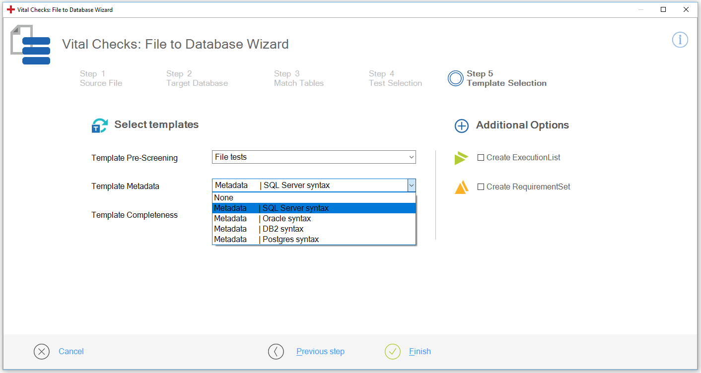 Um Ihre Testfall-Vorlagen unter Step 5 auswählen zu können, müssen Sie zunächst die entsprechenden Testfall-Vorlagen in den Ordner _DI Templates kopieren wie in Kapitel "Vital Checks: File to Database Wizard bedienen " beschrieben. |