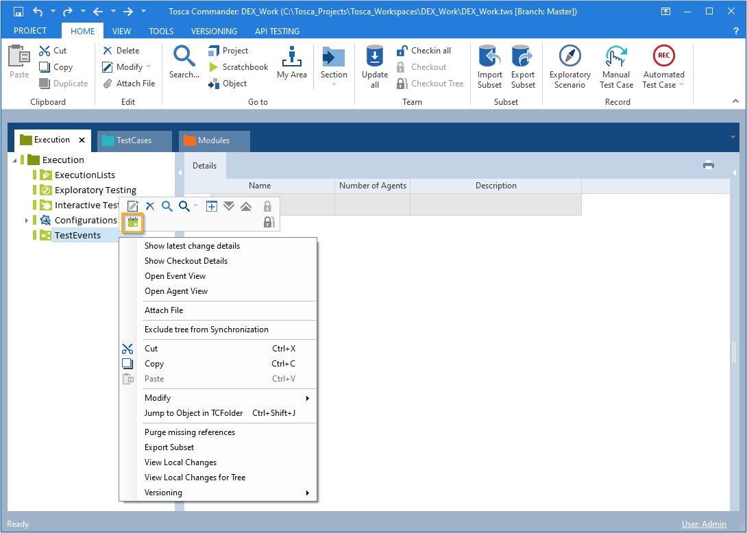 Um die Ausführung eines Testereignisses zu starten, klicken Sie mit der rechten Maustaste auf das Testereignis und wählen Sie im Kontextmenü Execute now.