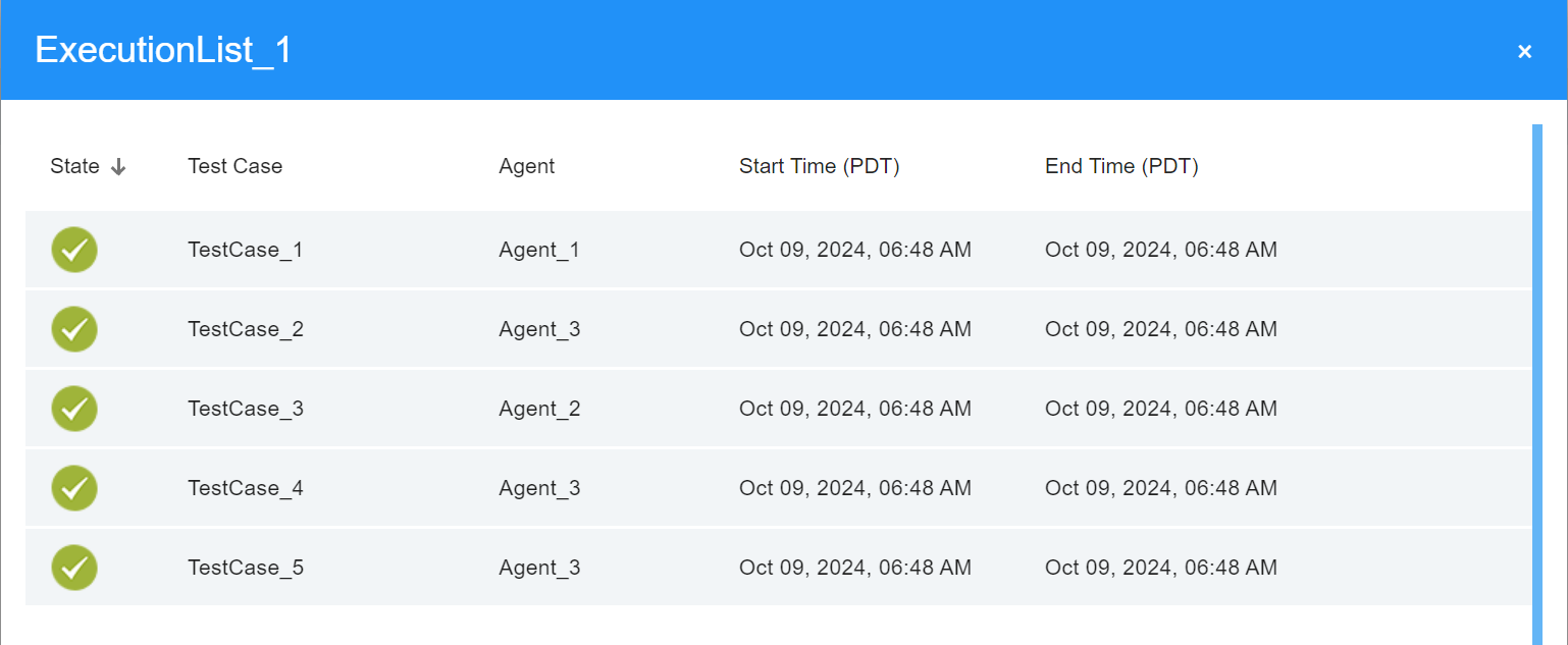 aus, um detaillierte Informationen zu erhalten: jeder Testfall in der Ausführungsliste, sein Status, seine Start- und Endzeit und welcher Agent ihn durchgeführt hat.