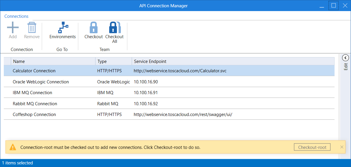 Wenn Sie in einer Multiuser-Umgebung arbeiten und die Konfiguration der API-Verbindungen eingecheckt ist, können Sie im API Connection Manager keine neue Verbindung hinzufügen. Sie müssen zuerst die Verbindungswurzel auschecken.
