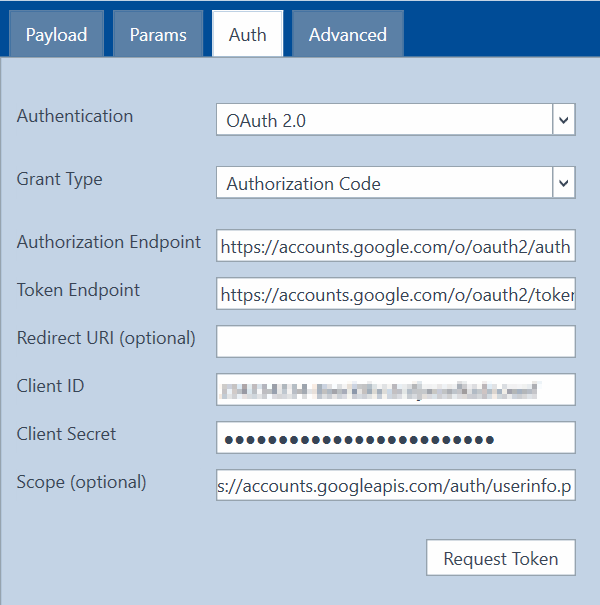 Wählen Sie im Aufklappmenü Authentication die Option OAuth 2.0.