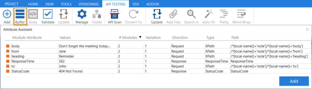 Klicken Sie auf Buffer im Menü API Testing. Dadurch öffnet sich das Attribute Assistant-Fenster.