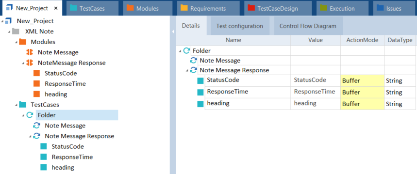 Das System fügt die Modulattribute aus dem Buffer zu den Modulen hinzu, zu denen sie gehören. Wenn Sie ein Element ausgewählt haben, das sowohl Module als auch Testfälle enthält, fügt das System auch die entsprechenden XTestschritte und XTestschrittwerte hinzu, springt zum Testfall und klappt die Testschritte auf.