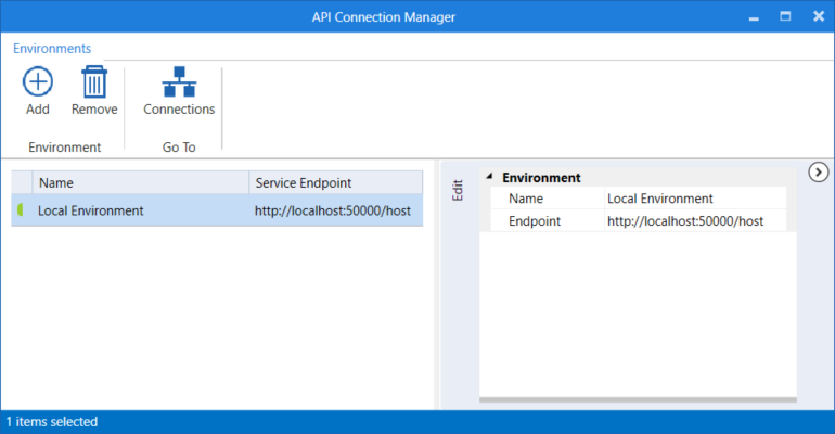 Das API-Environment in diesem Beispiel hat den Namen Local Environment und den Service-Endpunkt http://localhost:50000/host.