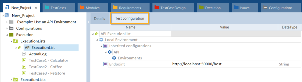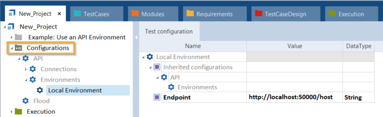 Der Reiter Test configuration zeigt außerdem an, dass jeder Testfall nun den Endpoint des API-Environment mit dem Wert http://localhost:50000/host verwendet.