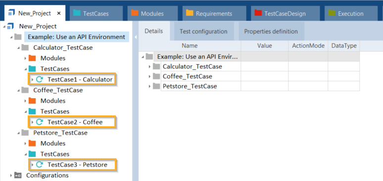 In diesem Beispiel verwenden Sie drei API-Testfälle: TestCase1 - Calculator, TestCase2 - Coffee und TestCase3 - Petstore.