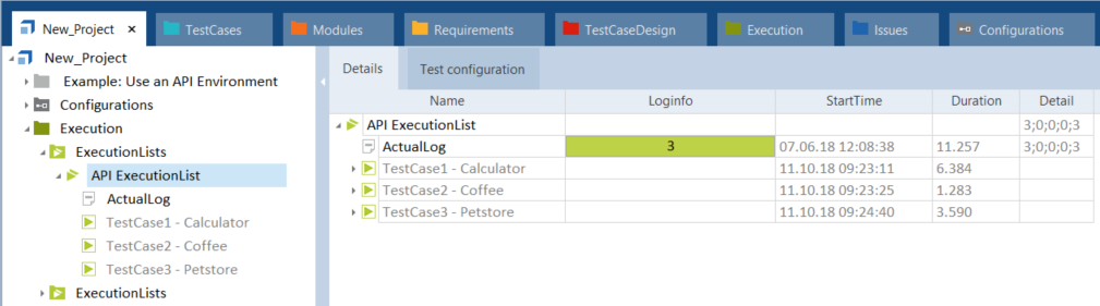Die Ausführungsliste in diesem Beispiel hat den Namen API ExecutionList und enthält die drei oben beschriebenen API-Testfälle.