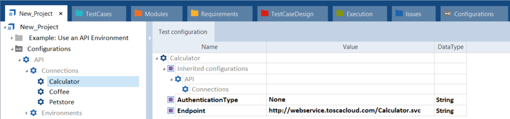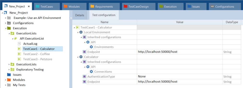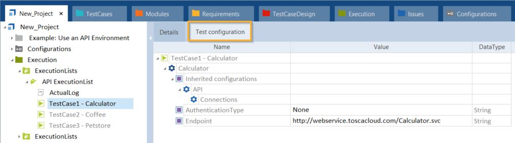 API-Verbindung von TestCase1 - Calculator im Reiter Test configuration