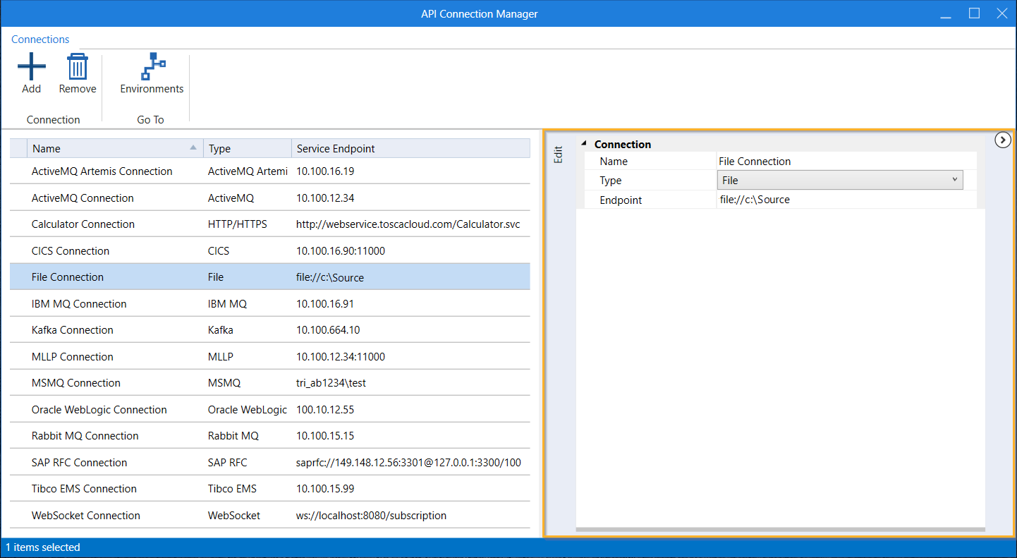 Sie können eine Dateiverbindung im API Connection Manager zum Laden und Schreiben von Dateien von und auf eine Festplatte konfigurieren.