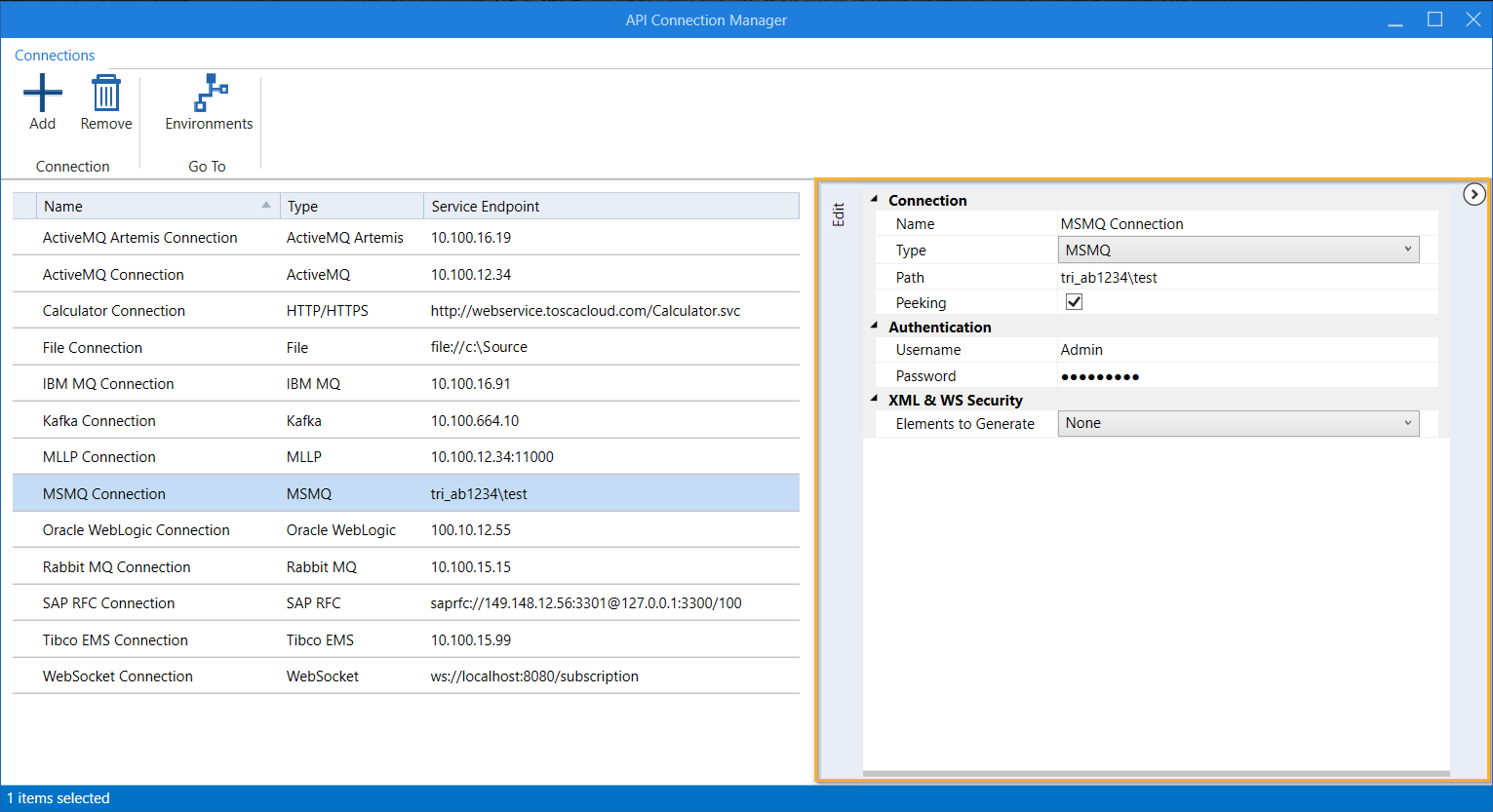 Sie können eine Microsoft Message Queuing (MSMQ)-Verbindung im API Connection Manager konfigurieren.
