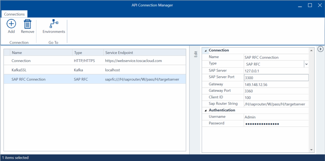 Sie können eine SAP RFC-Verbindung im API Connection Manager konfigurieren.