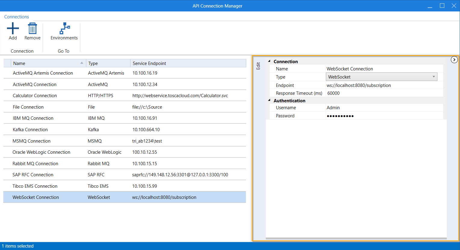 Sie können eine WebSocket-Verbindung im API Connection Manager konfigurieren.