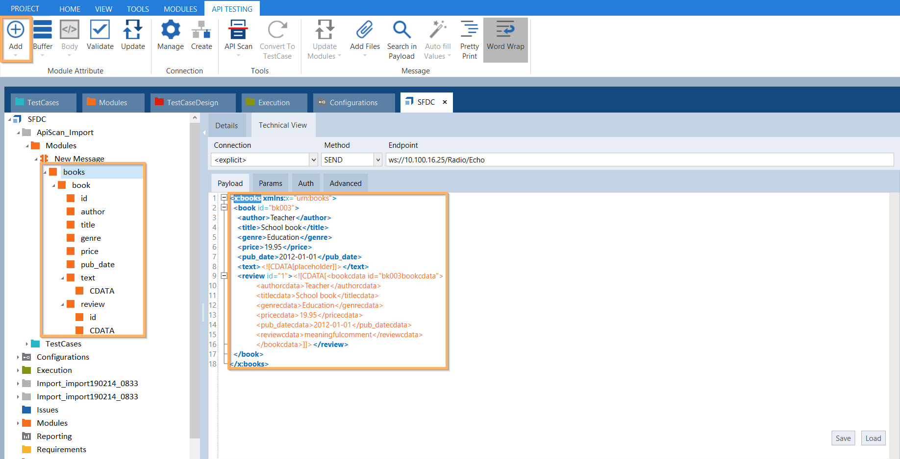 Die Tricentis Tosca API Engine ermöglicht es Ihnen, XML-basierte Modulattribute aus Nachrichten zu erstellen, die CDATA-Abschnitte enthalten. Der Inhalt innerhalb des CDATA-Abschnitts der Nachrichten-Payload wird entweder als XML, JSON oder normale Textdaten erkannt. Wenn der CDATA-Abschnitt gültige XML-Dokumente enthält, erkennt die API Engine diese als solche.