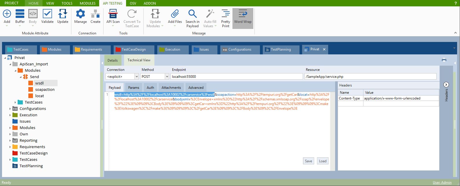 Die Tricentis Tosca API Engine ermöglicht es Ihnen, Modulattribute für URL-codierte Nachrichten zu erstellen. URL-codierte Nachrichten ersetzen Leerzeichen und unsichere ASCII-Zeichen durch gültige Zeichen. Der Inhaltstyp ist application/x-www-form-urlencoded. Wenn Sie den Inhalt Ihrer URL-codierten Nachrichten manuell erstellen, stellen Sie wie unten gezeigt sicher, dass dieser Inhaltstyp unter Headers aufgeführt ist.